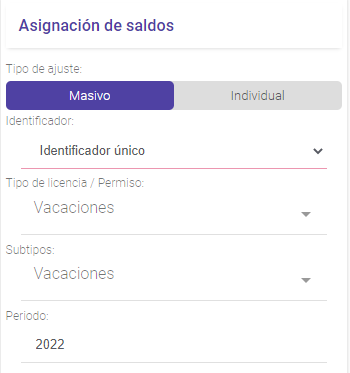➦ Periodo: Informar el periodo sobre el cual se va a realizar la asignación de saldos en la plataforma. Por ejemplo: 2025.