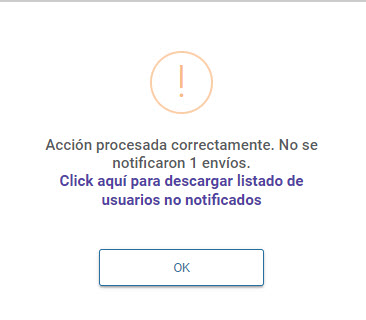 Nota: En caso de que el envío se haya realizado sobre un usuario que no tiene asociado un correo electrónico la plataforma notificará que el envío fue realizado pero sin enviar la notificación correspondiente.