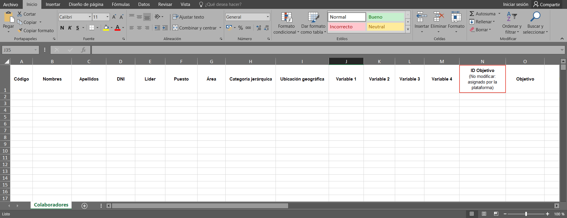 Permite añadir colaboradores de forma masiva mediante una plantilla de Excel. Debes completarla según las instrucciones incluidas, asegurando que todos los campos obligatorios estén llenos. - Importar objetivos