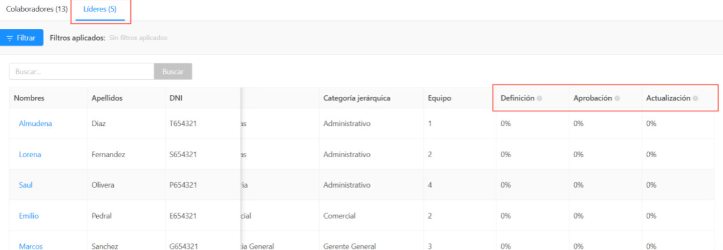 - Aprobación: Porcentaje de colaboradores con el 100% de objetivos aprobados.