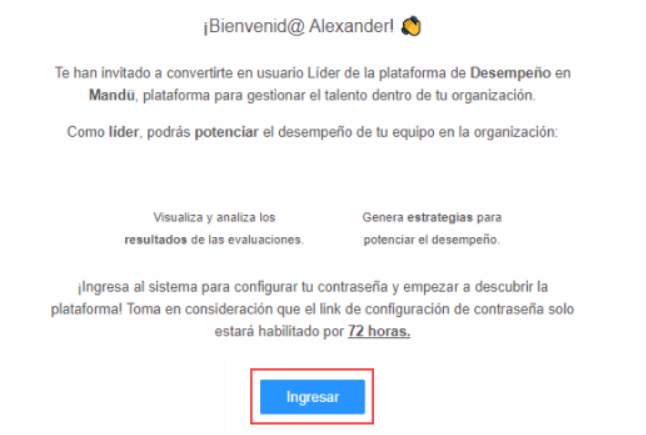 Paso 1: Recibirás un correo de Mandü, accede y dale clic a “Ingresar”. De esa forma podrás crear tu contraseña.