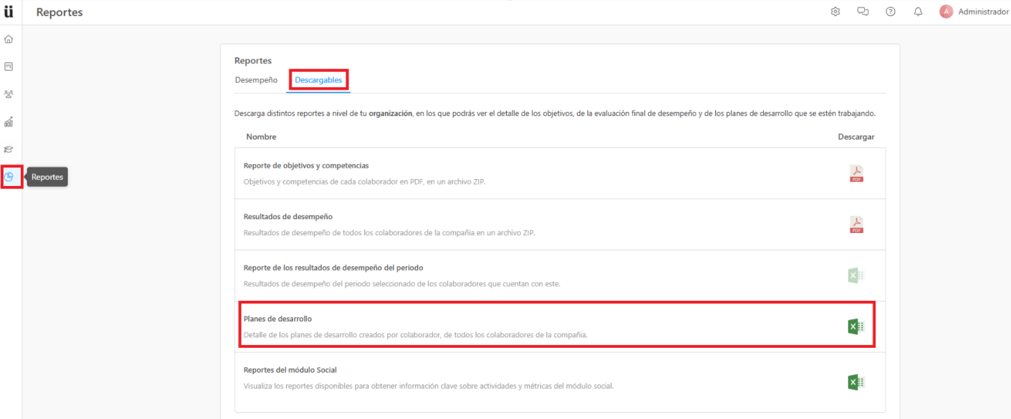 Para ello debes dirigirte a la sección “Reportes”, hacer clic en la pestaña "Descargables", elegir el tipo de planes que deseas descargar y darle clic en "Descargar".