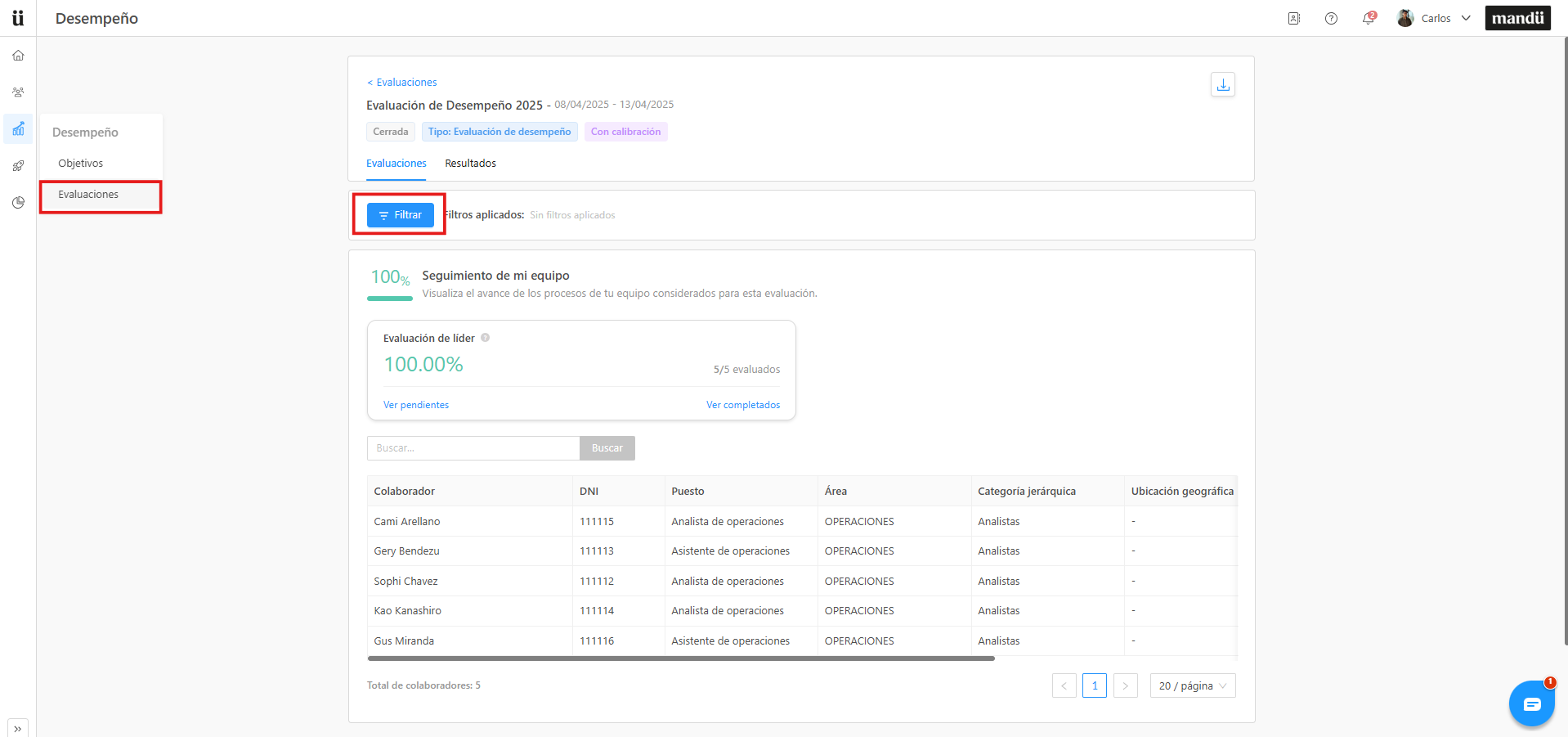 Incluye un la opción de Filtrar para localizar colaboradores por: Área, Categoría jerárquica, Estado de evaluación, Feedback, etc.