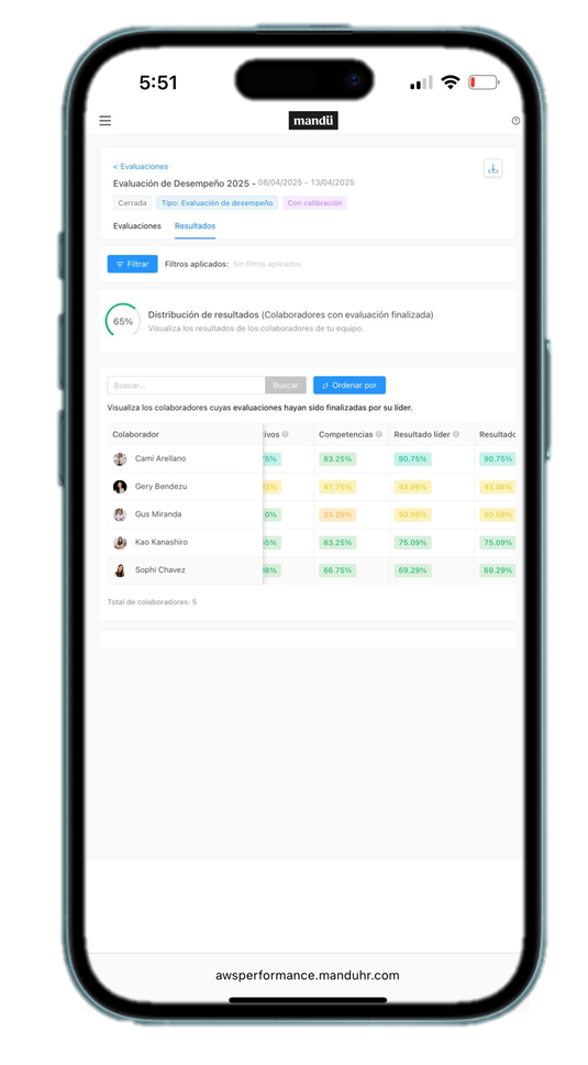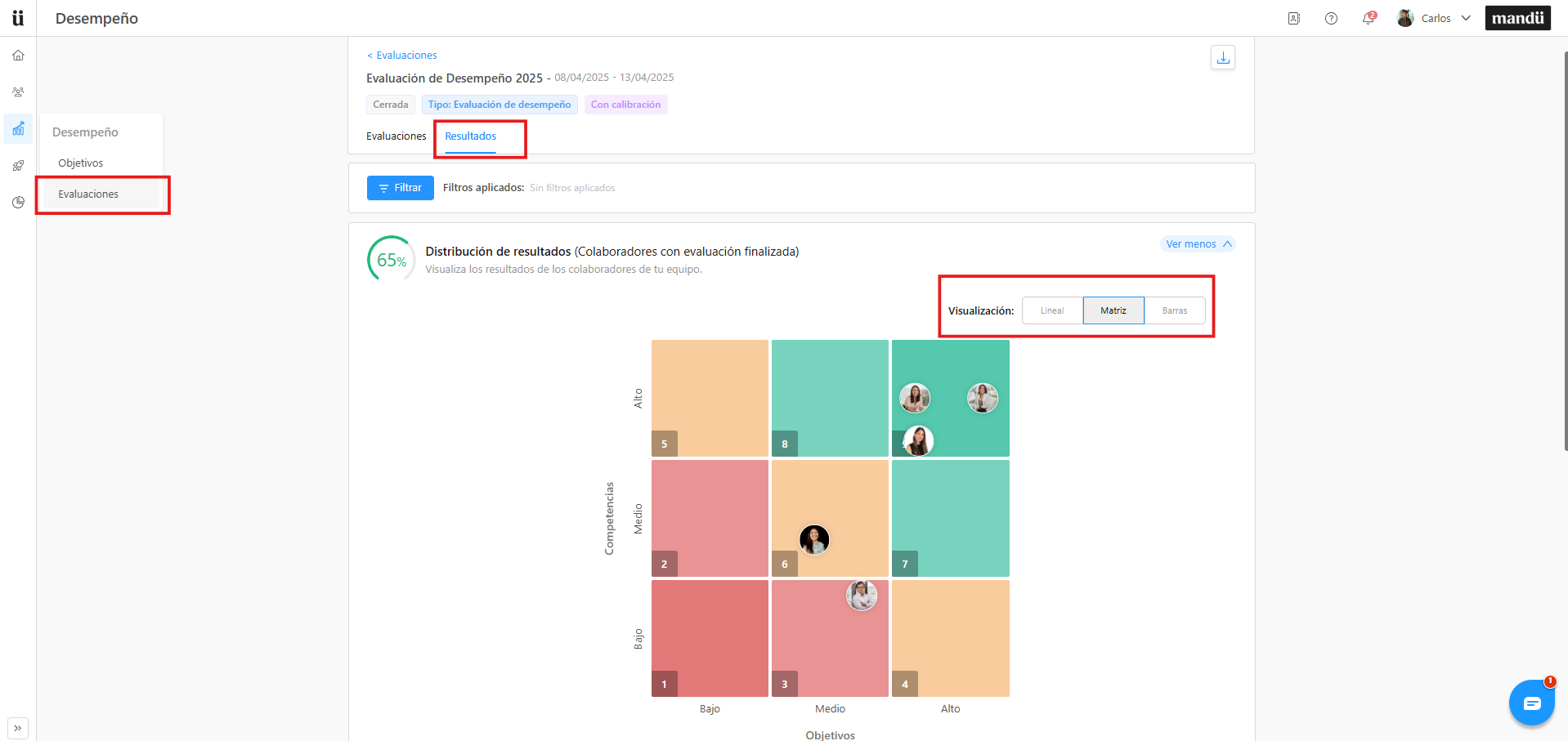 En la matriz, al pasar el cursor sobre la foto del colaborador verás el % de objetivos y competencias.