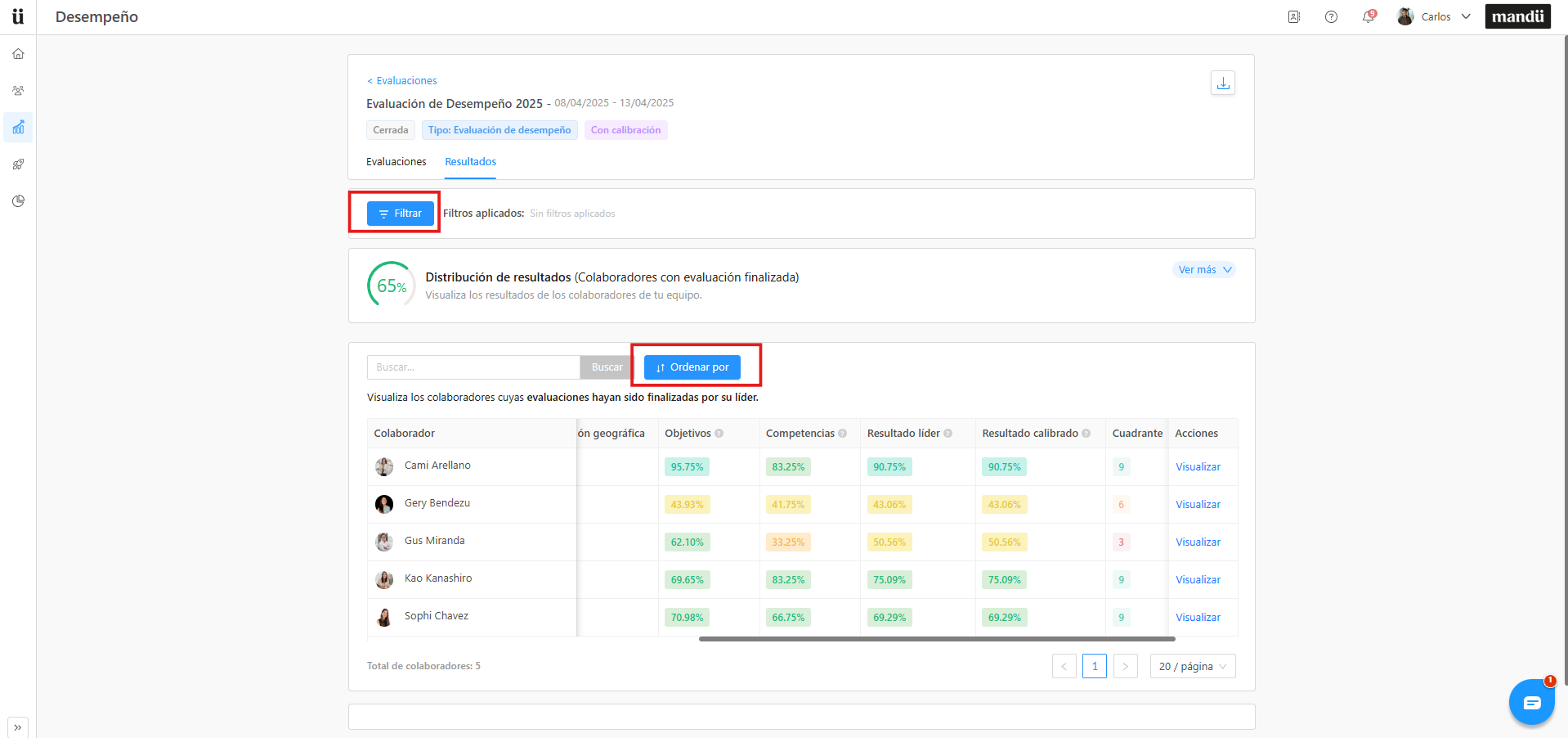 Ordenar por: organiza la información por nombre, apellidos, objetivos, competencias, resultado final, resultado calibrado o cuadrante.