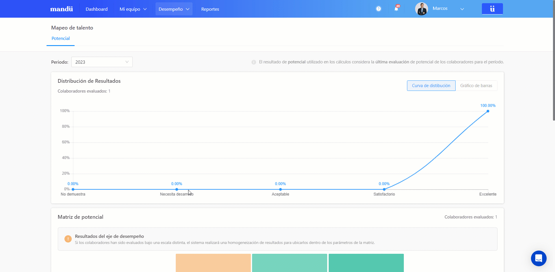 Como líder, es fundamental analizar los resultados de las evaluaciones de tu equipo. Desde la opción Mapeo de Talento, podrás visualizar los resultados de Potencial tanto a nivel de rangos como en la matriz NineBox, siempre por periodo de evaluación.