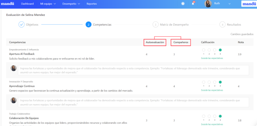 Al hacer clic en “Evaluar” puedes completar cada evaluación que tengas pendiente, solo debes realizar un flujo similar al siguiente. Recuerda que una evaluación de 180-360º solo permite evaluar las competencias de otros.