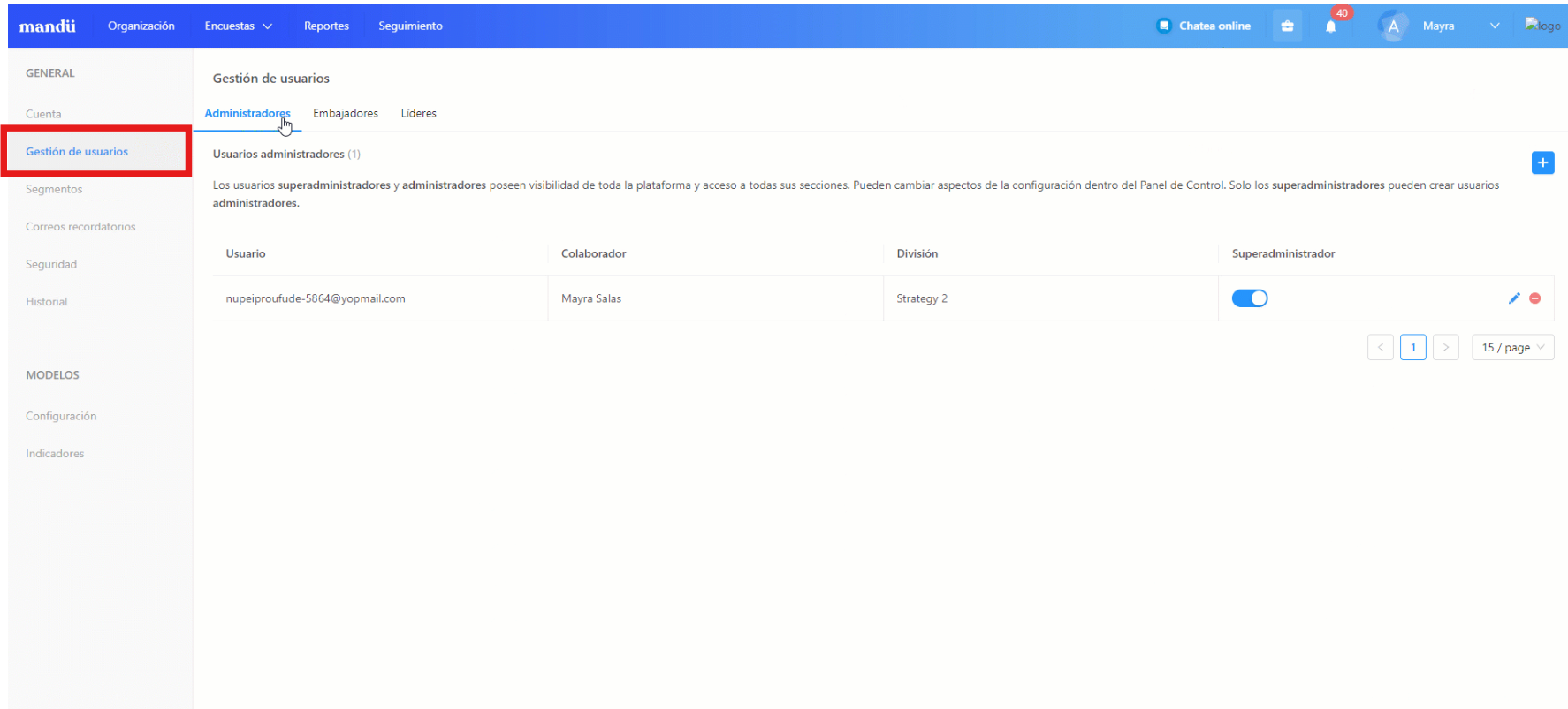 En este segmento podrás definir qué usuarios de tu organización deseas nombrar como administradores o superadministradores dentro de la plataforma. Para designar estos roles ten en cuenta lo siguiente: