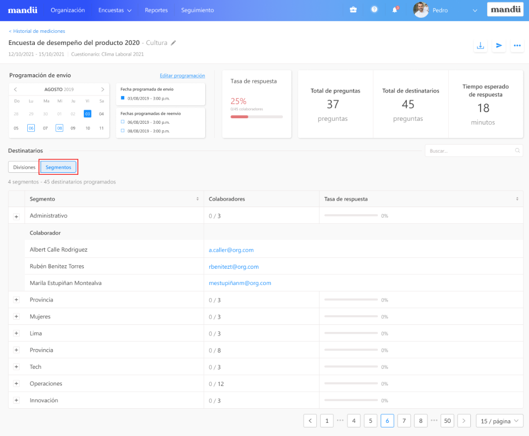 Como parte de la verificación de destinatarios, este paso te brinda visibilidad acerca de qué colaboradores tienen asignado más de un cuestionario por pertenecer a más de un segmento durante el paso de agendado de la medición.
