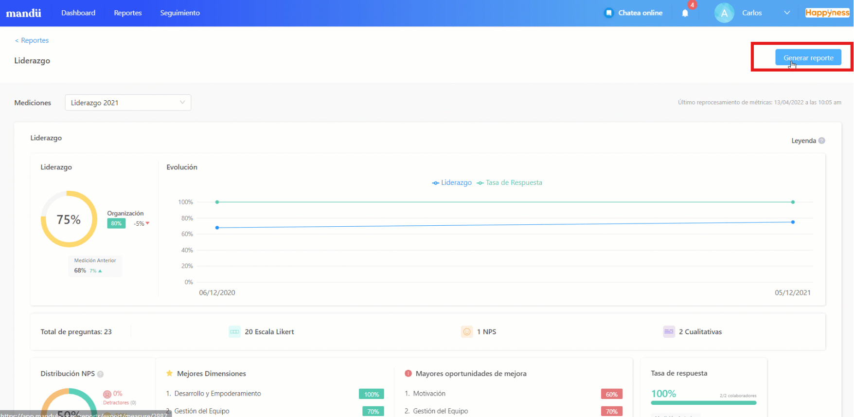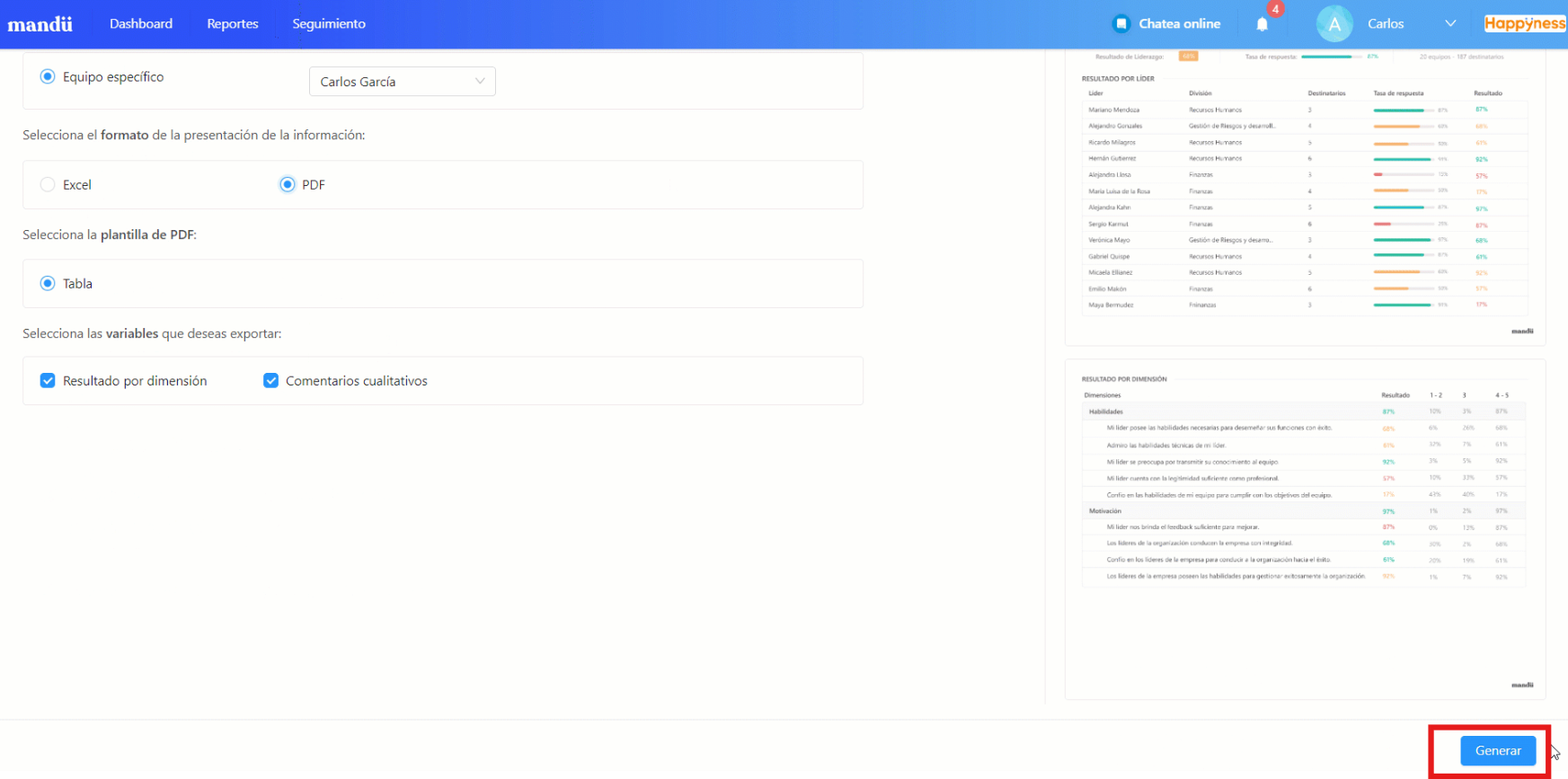 Paso 2: Selecciona la medición de Liderazgo y pulsa la opción “Generar reporte”.