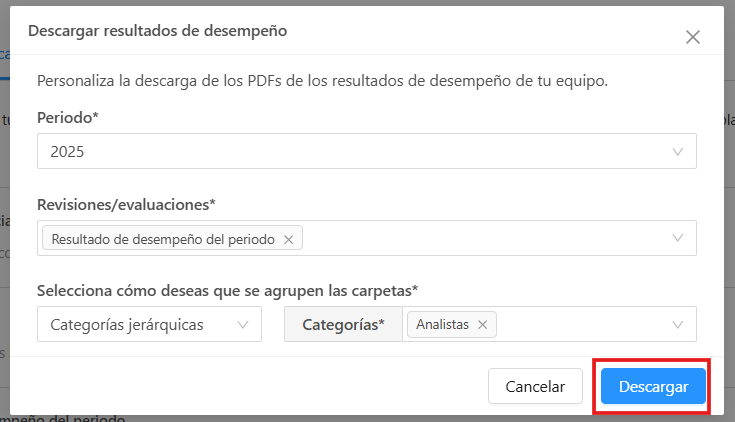La plataforma te permite descargar los reportes de desempeño de tu equipo en formato PDF. Puedes hacerlo de dos formas: desde el perfil del colaborador o desde la sección Descargables en Reportes.